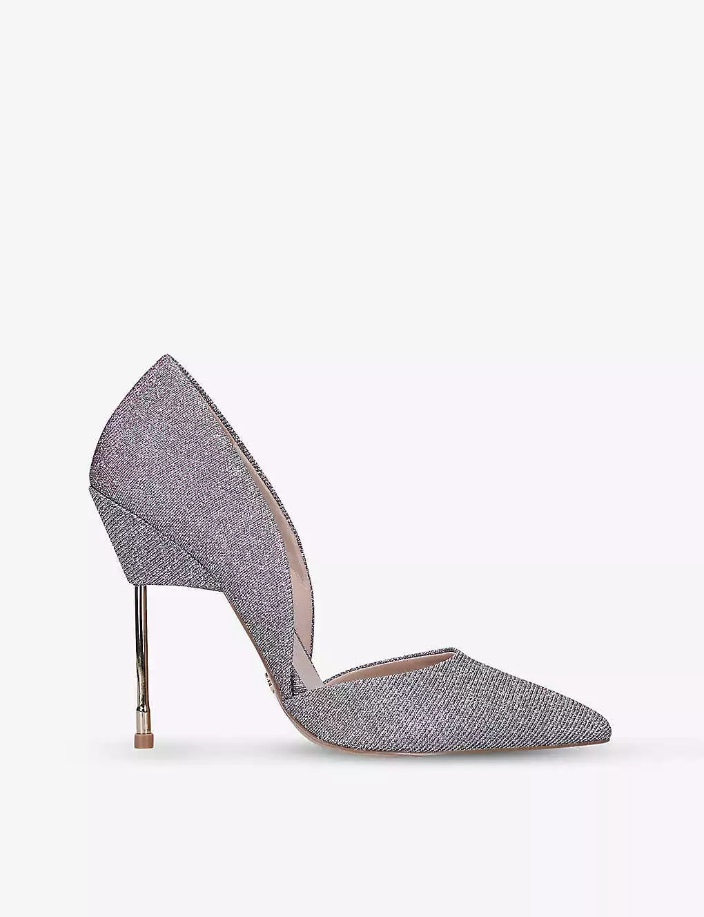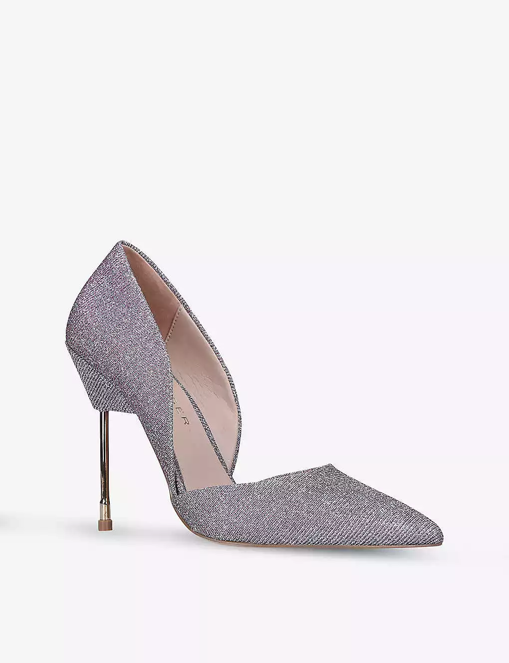 - Pointed toe, all-over textured, glittered finish, d’Orsay cut-out style, gold-toned metal stiletto heel