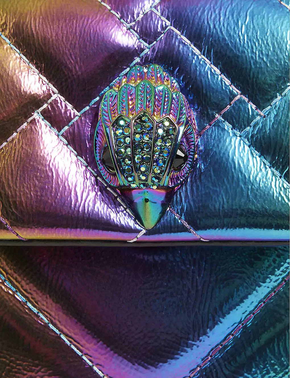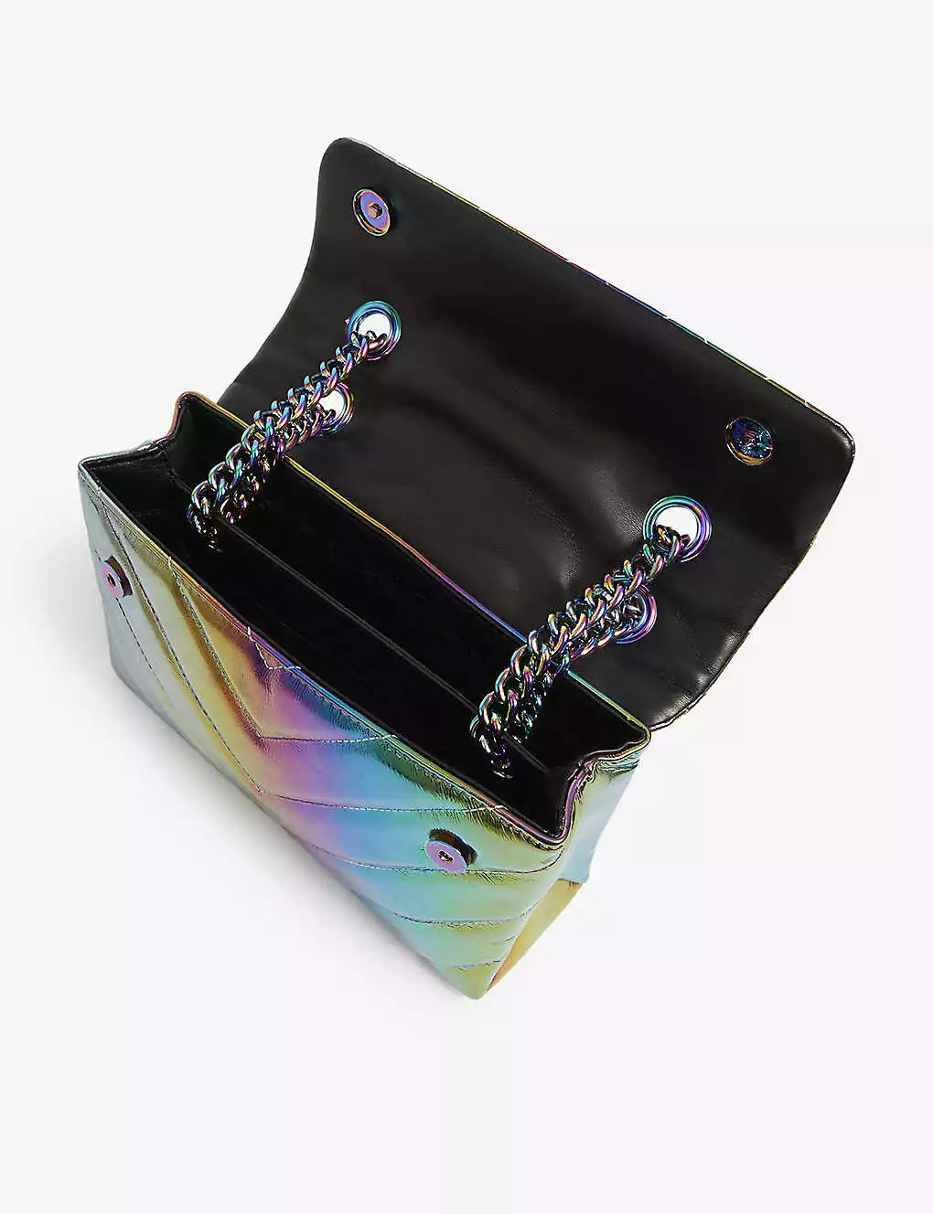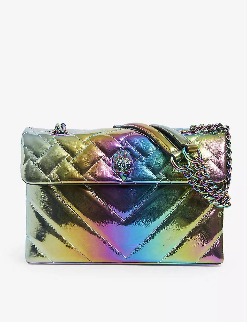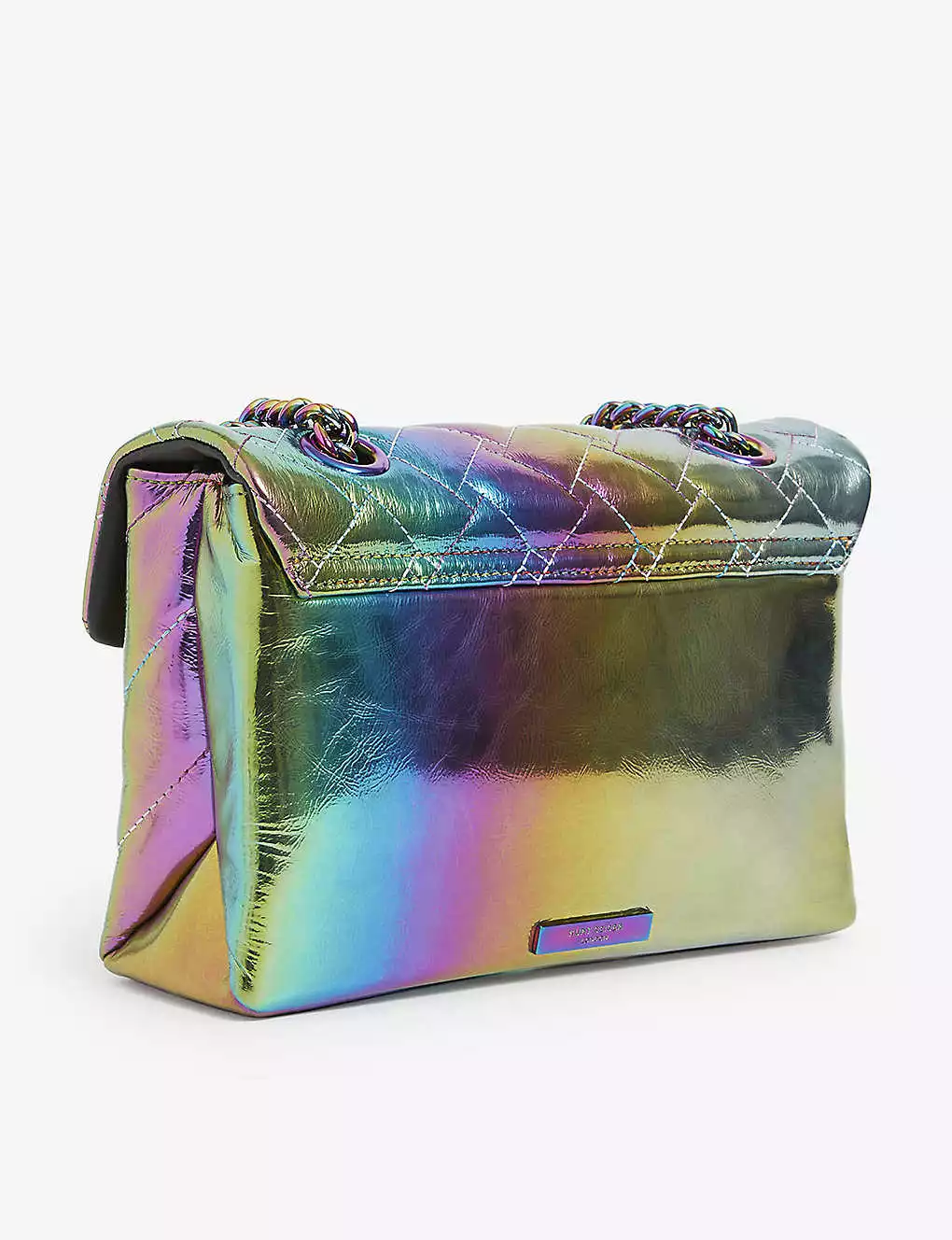 - Curb chain strap, metallic rainbow effect, quilted design, jewelled detail, two compartments