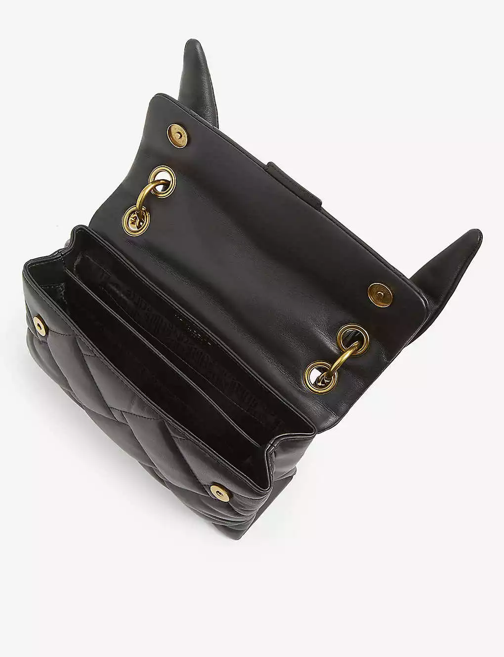 - Fold over flap, adjustable leather top handle, adjustable chain shoulder strap, two compartments, interior slip pocket, quilted, gold-toned hardware, printed branding on back, embellished signature eagle emblem