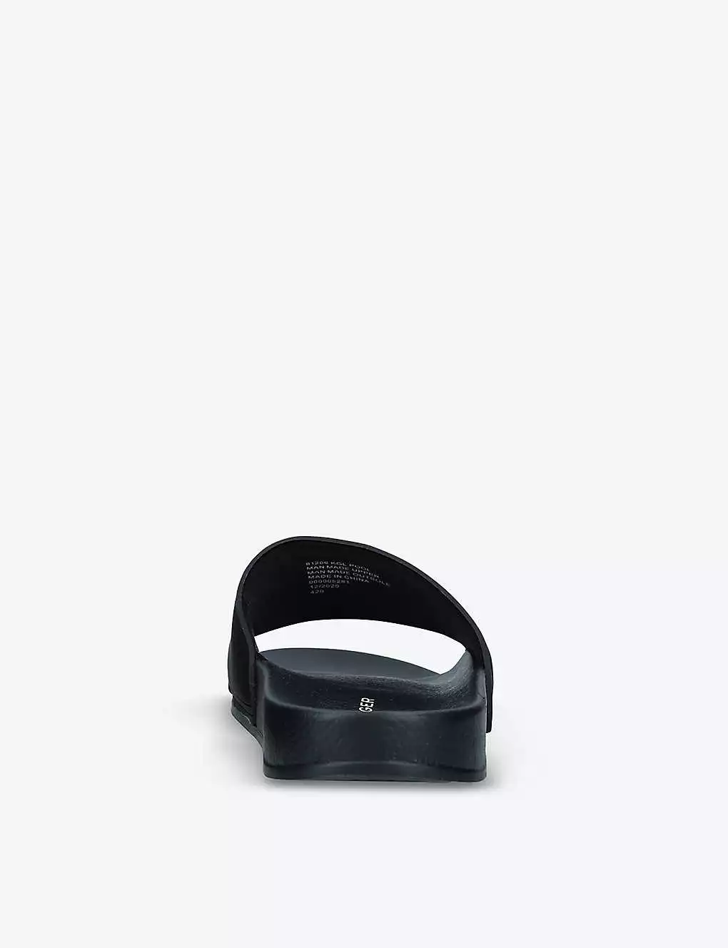 - Open round toe, contrast branding embossed at front strap, curved outsole, backless