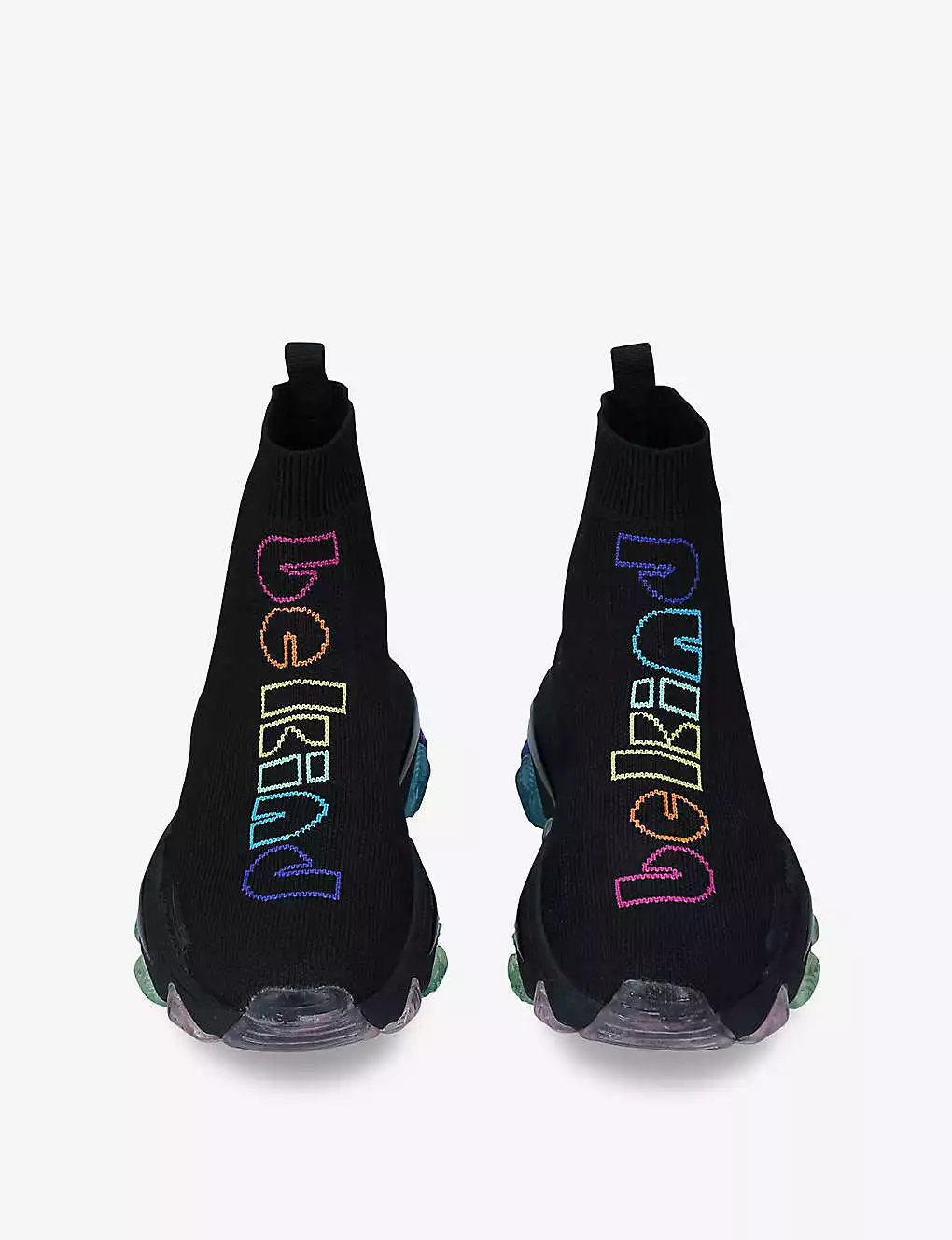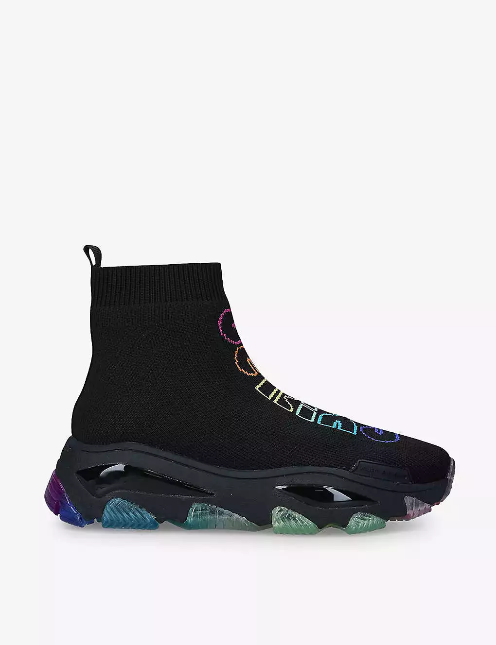 - Round toe, knitted sock upper, branded, ‘Be Kind’ intarsia at front, pull-up tabs, chunky sole, contrasting sole inserts
