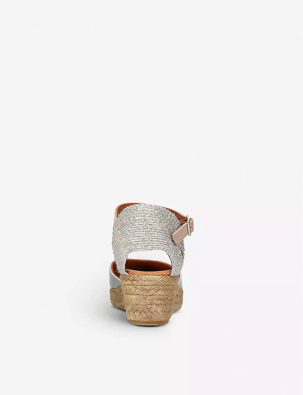 Round toe, metallic leather front, woven raffia back-strap, jute wedge sole