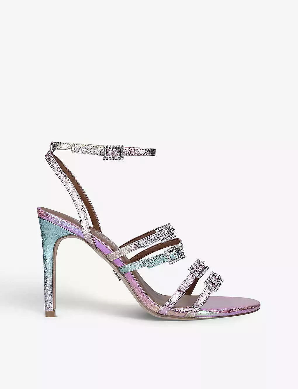 - Stiletto heel, open round toe, multiple straps, gem-embellished