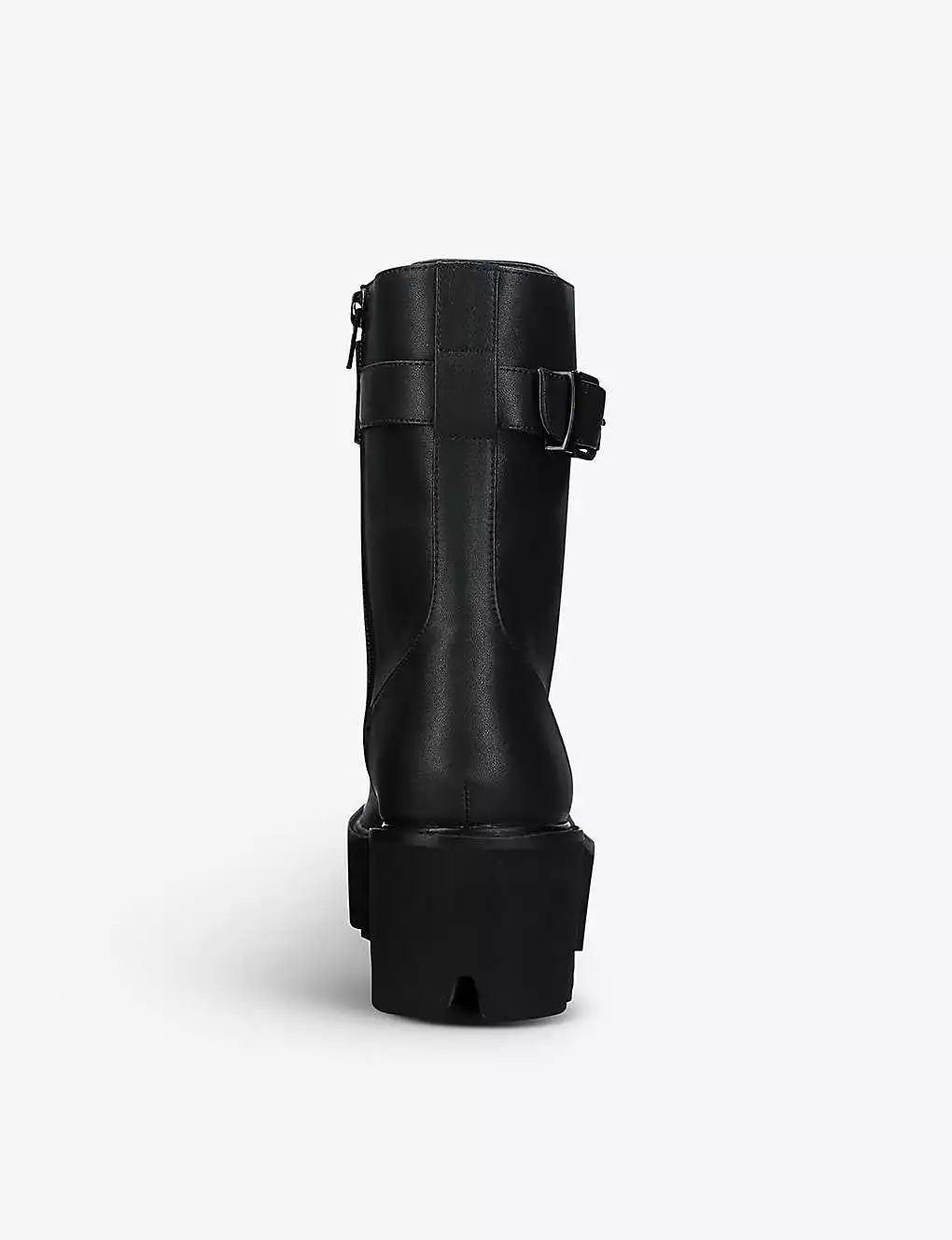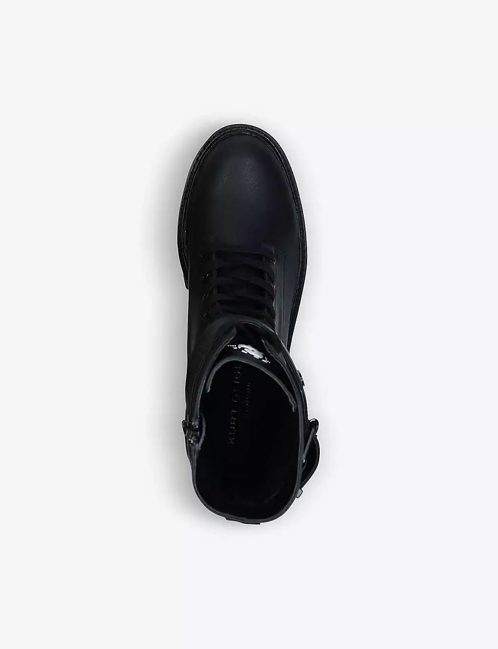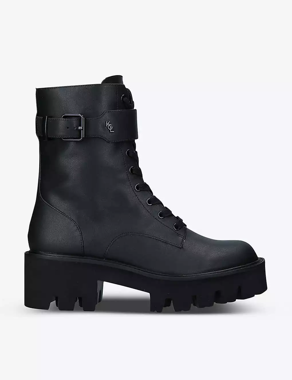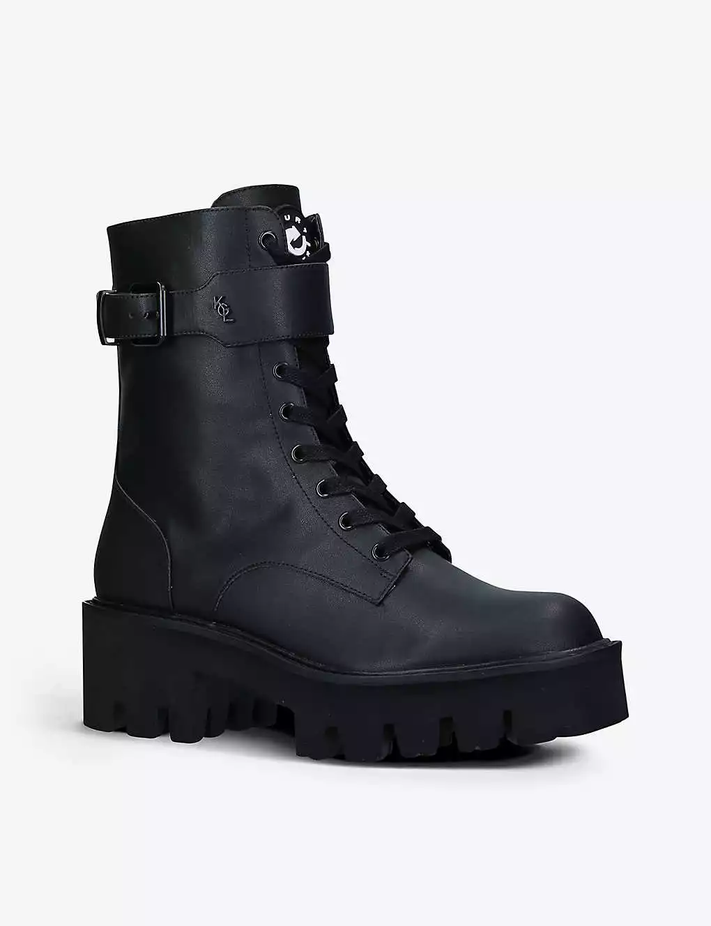 - Round toe, exaggerated lug sole, lace-up front, single buckle at the ankle, branding at tongue and buckle